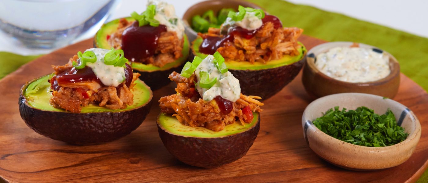 2. Agrega 1 cucharada de aceite de oliva a la sartén. Sofríe la cebolla, el pimiento morrón y el ajo. Agrega la carne de cerdo desmenuzada y ¼ de taza de tu salsa BBQ favorita. Distribuye uniformemente entre las mitades de aguacate.