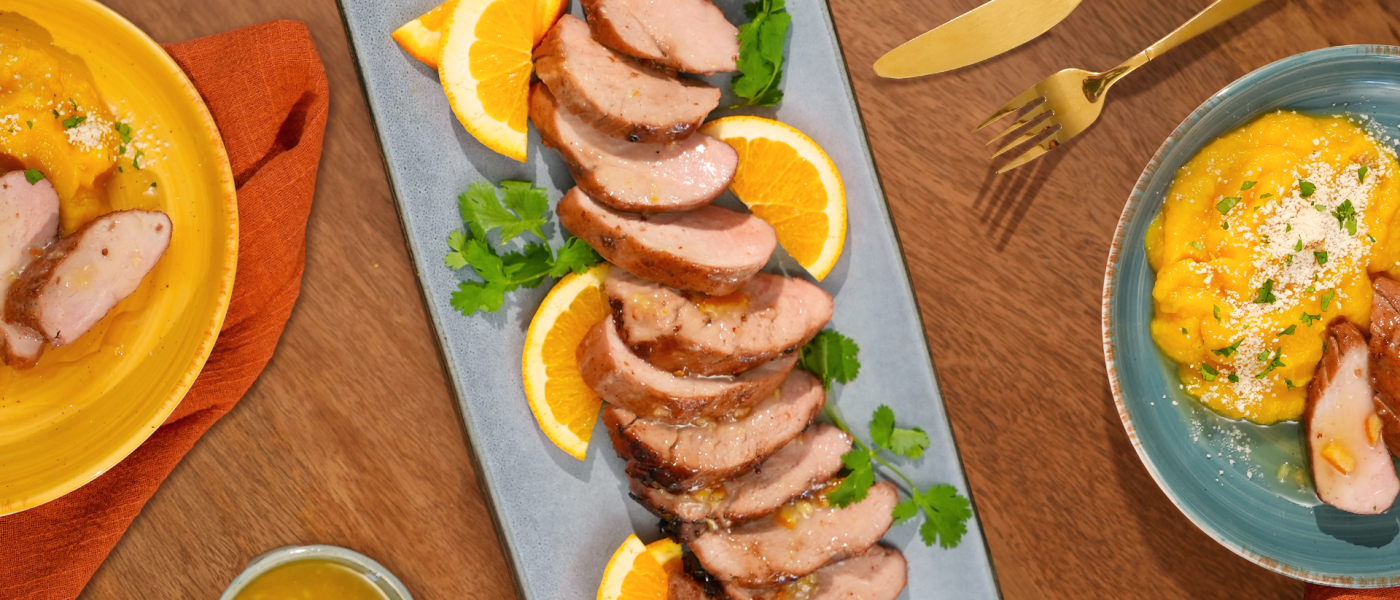 - Corta el cerdo en rebanadas de 3/4 de pulgada de grosor y transfiere a un plato para servir. Úntale el glaseado de naranja con una brocha y sirve con el puré de calabaza butternut. Agrega queso cotija. ¡Buen provecho!