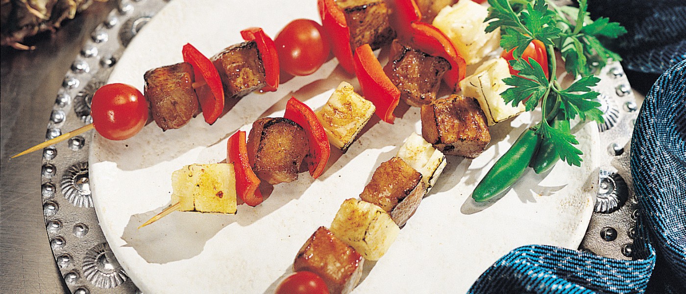 4. Saca los trocitos de cerdo del marinado e insértalos en palitos de madera bañados en agua, o en alambres de metal, alternando con los pimientos morrones, la piña y los jitomates cherry.
