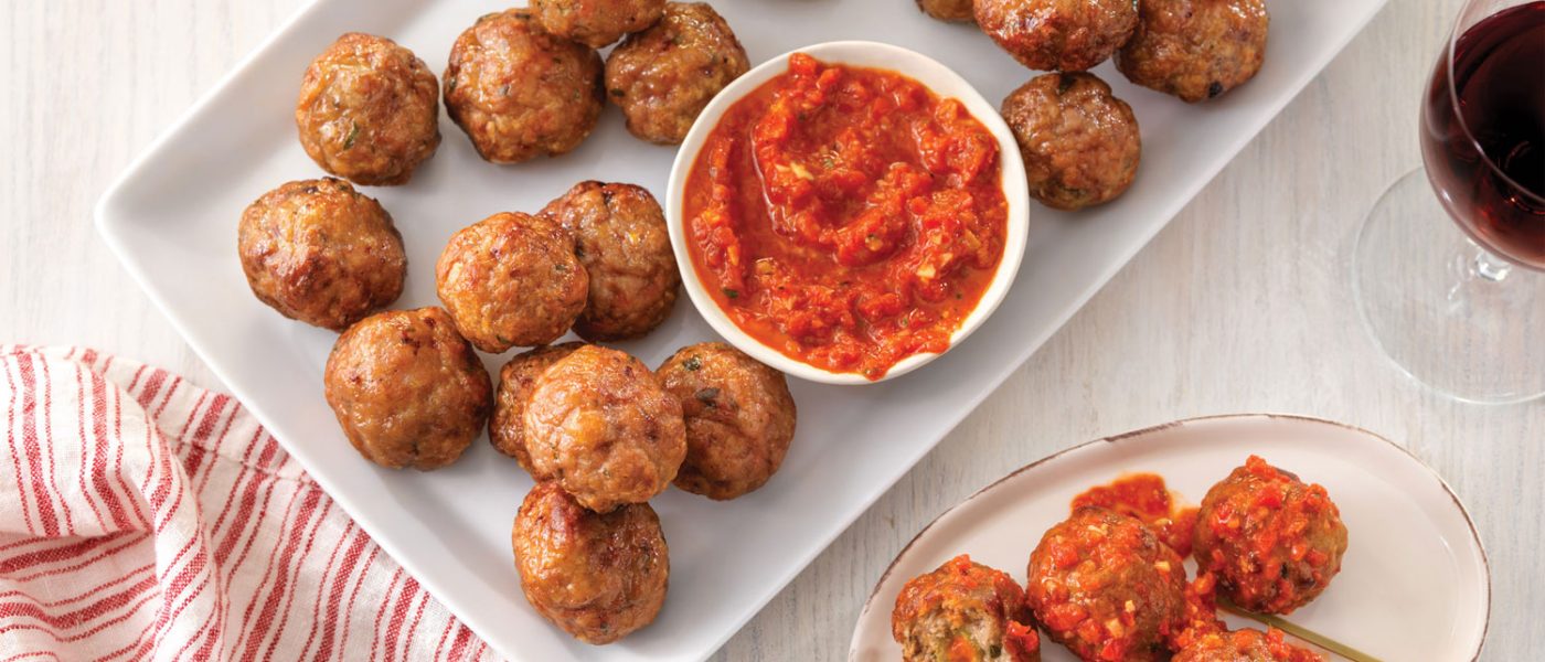 Albóndigas de Cerdo Rellenas con Salsa Romesco