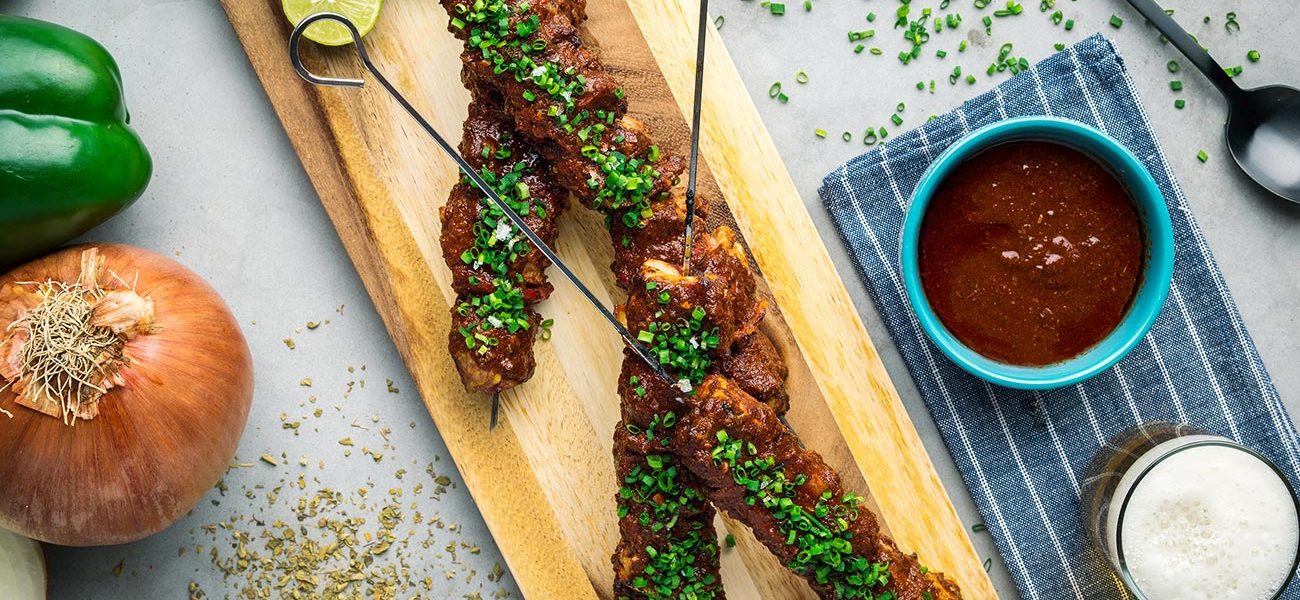 - Coloca los pinchos sobre la parrilla, cúbrelos con el adobo de ají panca. Cocina a una temperatura interna de entre 145-160 grados F con 3 minutos de reposo.