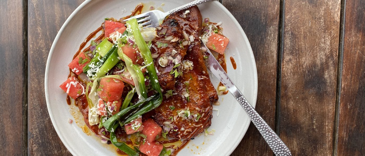 Bistec de espaldilla de cerdo a la parrilla con adobo de guajillo. Servidos con salsa barbacoa “Guagua” y ensalada de sandía con queso fresco.