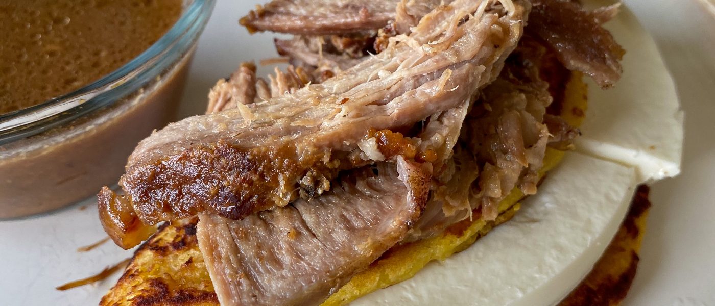 Para armar este delicioso plato, tomamos una cachapa caliente (que normalmente también se venden ya elaboradas y congeladas en el supermercado), la calentamos en un sartén hasta que esté dorada. Luego, la sacamos y le agregamos de un lado el queso de tu preferencia (a mí me gusta el queso de mano o guayanés). ¡Dobla la cachapa por la mitad y encima agrégale el pernil de cerdo con su salsa!