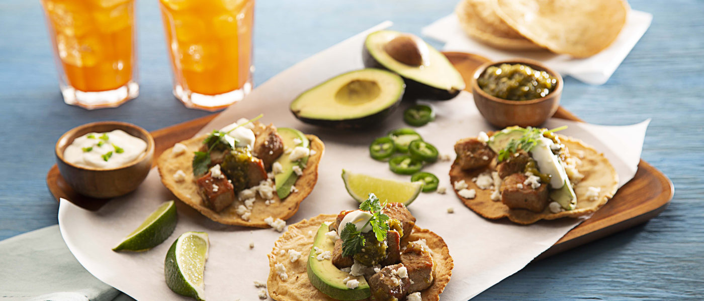 Sirve la carne de cerdo al chile verde encima de la tostada. Adereza con aguacate en cubitos, queso cotija y crema.