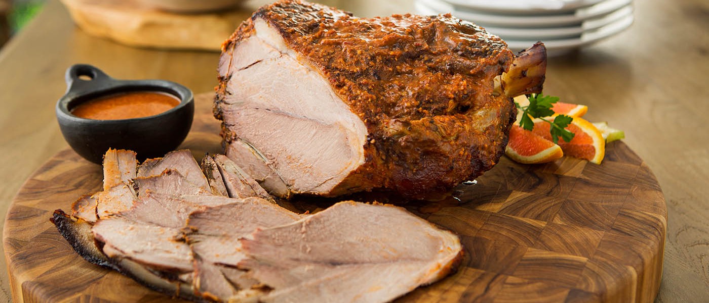 - Asa el cerdo a 325° F de 1-1/2 a 2 horas o hasta que el termómetro de carnes registre 150° F en el centro del cerdo.