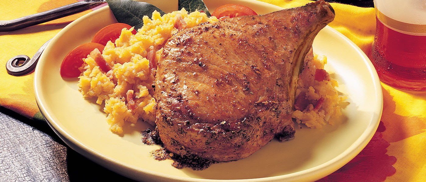 Sirva las chuletas montadas sobre un montículo de plátanos.