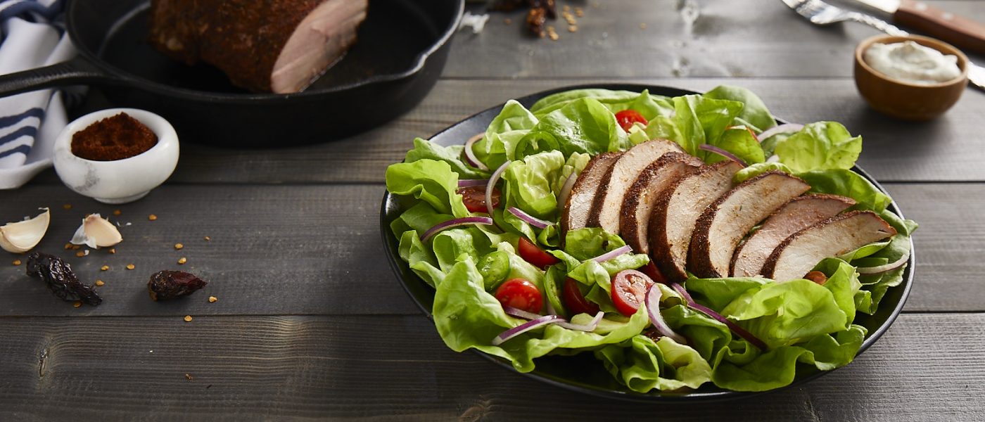 El comino ahumado con el chipotle picante es una combinación deliciosa. Corta este jugoso lomo de cerdo en rodajas y ponlo sobre una base de lechuga para una receta saludable y refrescante. Decora con tus verduras favoritas y rocía ligeramente con aderezo para añadir un toque singular.