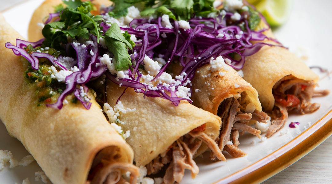 7. Organiza las flautas en un plato y cúbrelas con el repollo rallado, el cilantro picado, la salsa verde, la crema agria y el queso fresco.