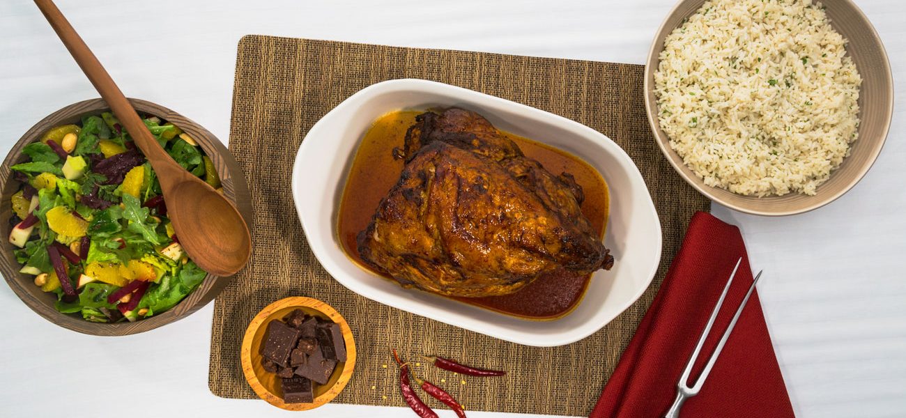 Este plato de cerdo se sirve tradicionalmente con arroz blanco y la típica ensalada navideña mexicana (similar a una ensalada Waldorf, que lleva manzanas). Las sobras son ideales para colocar sobre tortillas calientes.