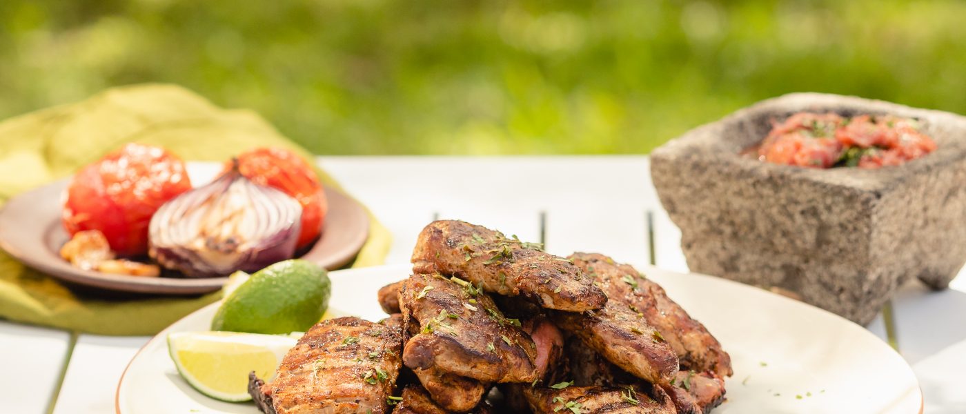 Sirve el poc chuc con la salsa de chiltomate y tortillas frescas.