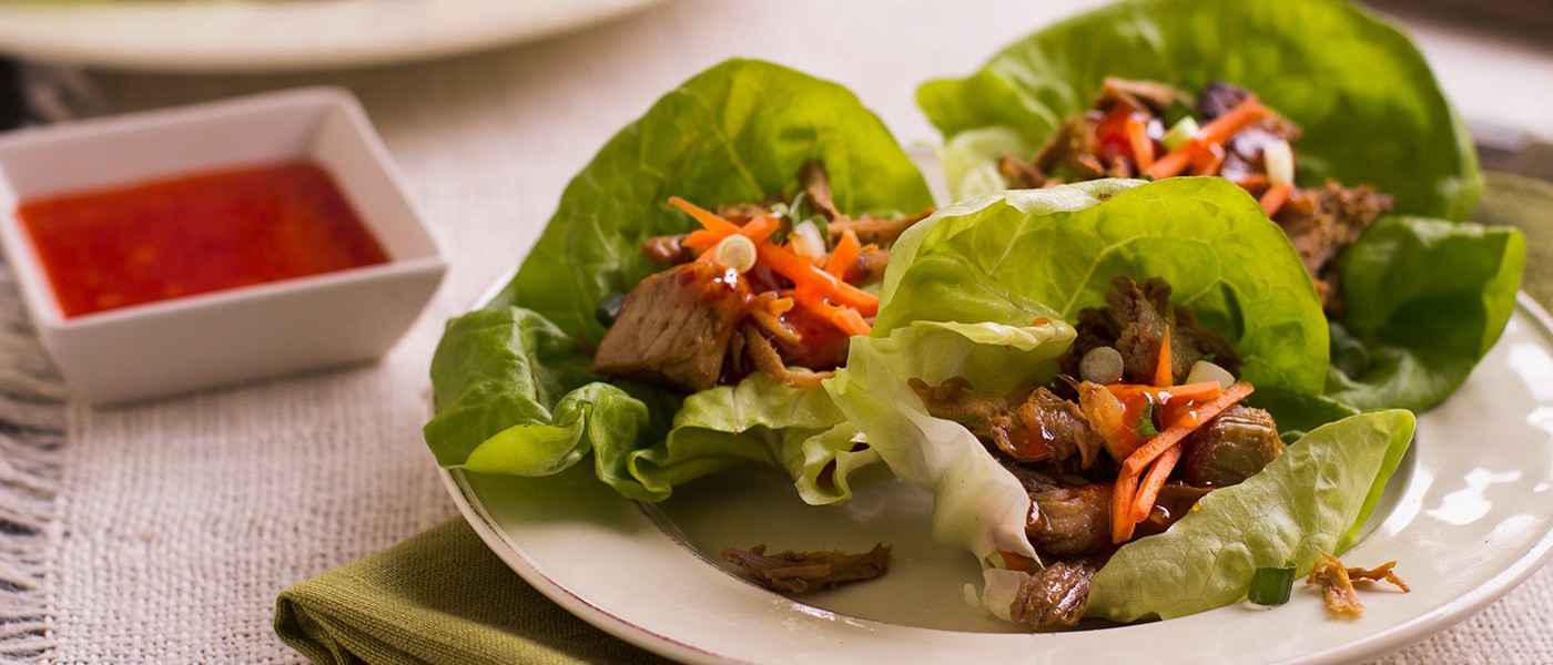 - Para cada taquito, agrega cerdo a una hoja de lechuga y cúbrelo con un poco de zanahorias y salsa vietnamita. Sírvelo con salsa picante adicional.