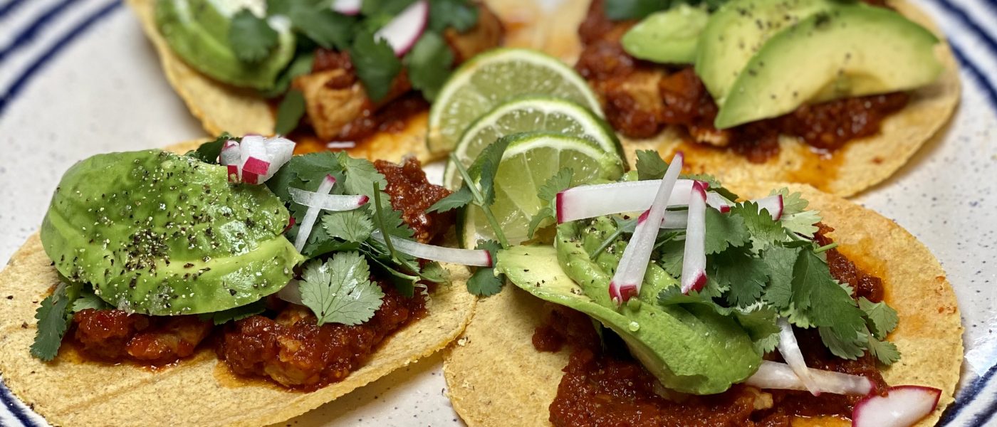 6. Sirve la carne de cerdo sobre las tostadas, y coloca encima las rodajas de aguacate, el rábano fresco, el cilantro y exprime unas gotas de jugo de limón.