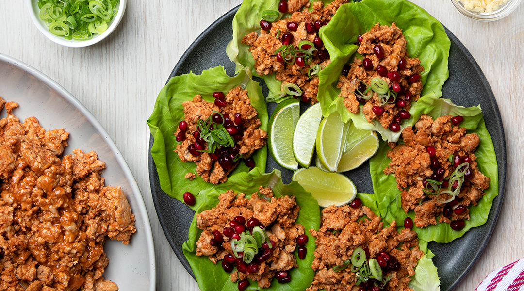 -Divide el cerdo cocido en partes iguales entre las hojas de lechuga, o preséntalo como una opción para servirse uno mismo, y cubre con la cebolla verde, la granada fresca y un chorrito de jugo de limón verde fresco.