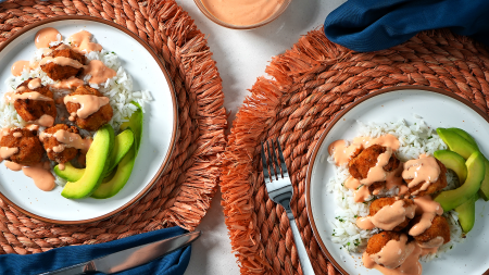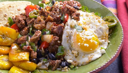 Este colorido plato costarricense, que tiene chorizo, pimientos rojos, frijoles, arroz y cilantro, es toda una fiesta para los ojos. Acompañado de plátanos fritos y tortillas de maíz, constituye una comida completa. Coloque un huevo frito sobre cada porción, si lo desea, y adorne con queso cotija rallado y cilantro picado. Consejo: Los plátanos y el almíbar se pueden preparar con anticipación y colocarlos en la parte de atrás de la estufa. Cuando el gallo pinto esté listo, simplemente recaliente los plátanos ligeramente con el almíbar.