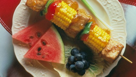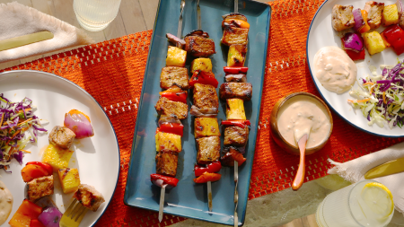 Saca los trocitos de cerdo del marinado e insértalos en palitos de madera bañados en agua, o en alambres de metal, alternando con los pimientos morrones, la piña y los jitomates cherry.
