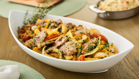 Saltee de 1 a 2 minutos la carne hasta que se dore. Coloque el recipiente en el horno. Hornee de 25 a 30 minutos, hasta que la carne esté blanda. Sírvala caliente.