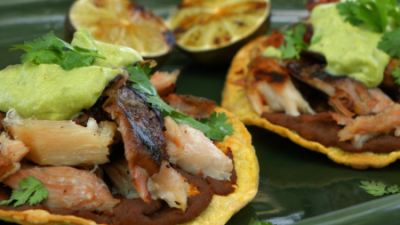 Ensambla los tacos: con una cuchara, pon picadillo de cerdo sobre las hojas de lechuga, coloca encima cebollas caramelizadas y poblanos, y finaliza con una cucharada de crema de aguacate.