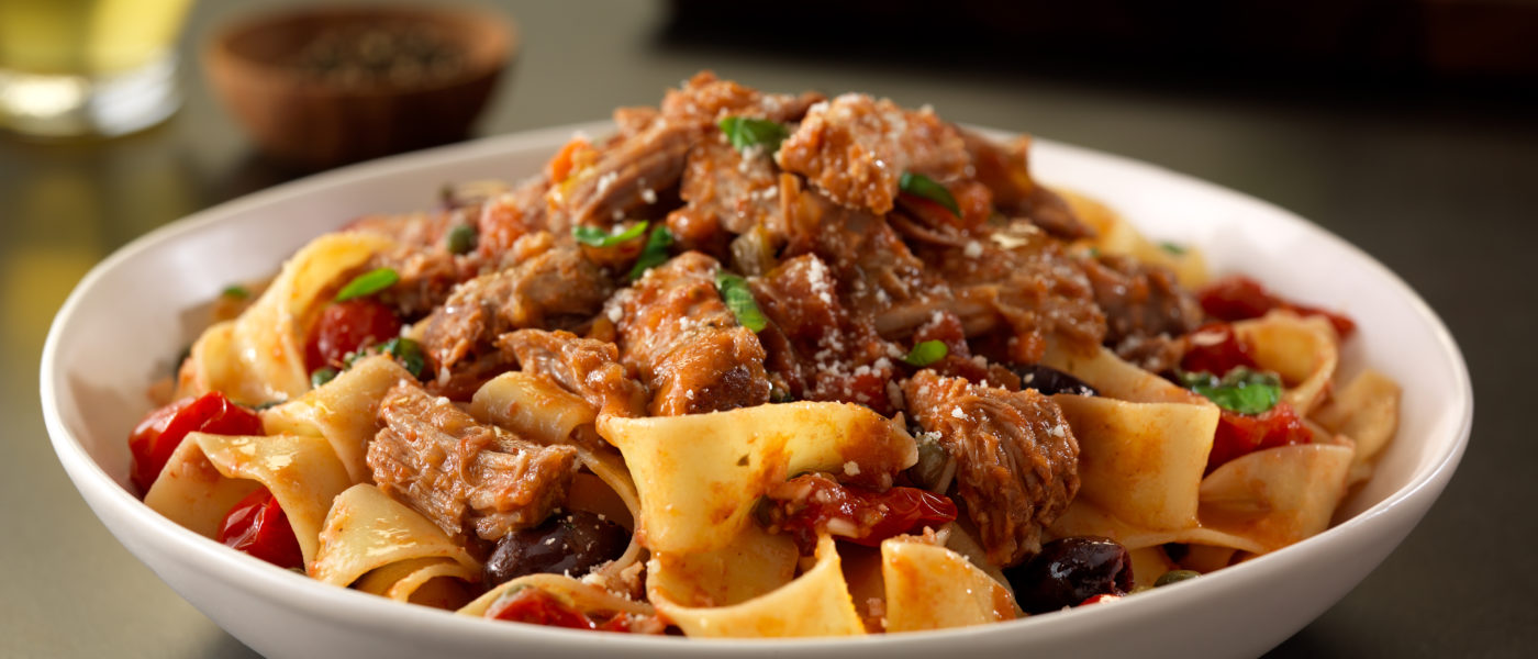 Carne de Cerdo con Pasta Pappardelle Puttanesca, Albahaca y Queso Pecorino