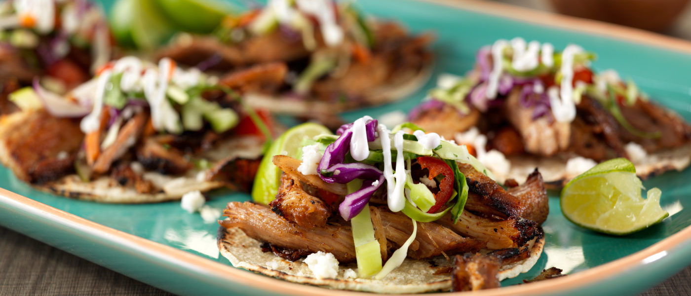 - Para servir: Colocar la carne de cerdo en las tortillas y cubrir con repollo, una poco de crema, y una pizca de queso fresco. Servir con cuñas de lima.