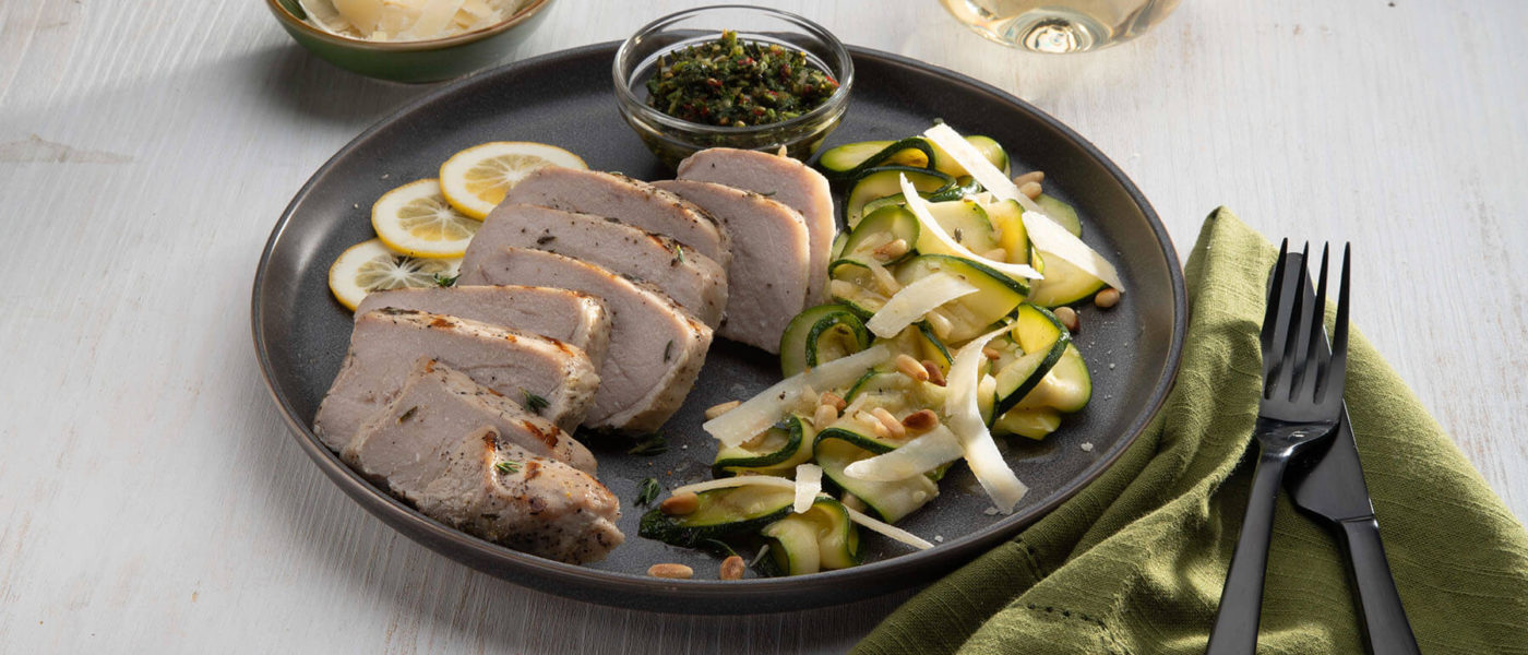 Adorna la ensalada de calabacín con algunos piñones tostados y el queso rallado. Vierte el chimichurri sobre la carne de cerdo o sírvela a un lado.