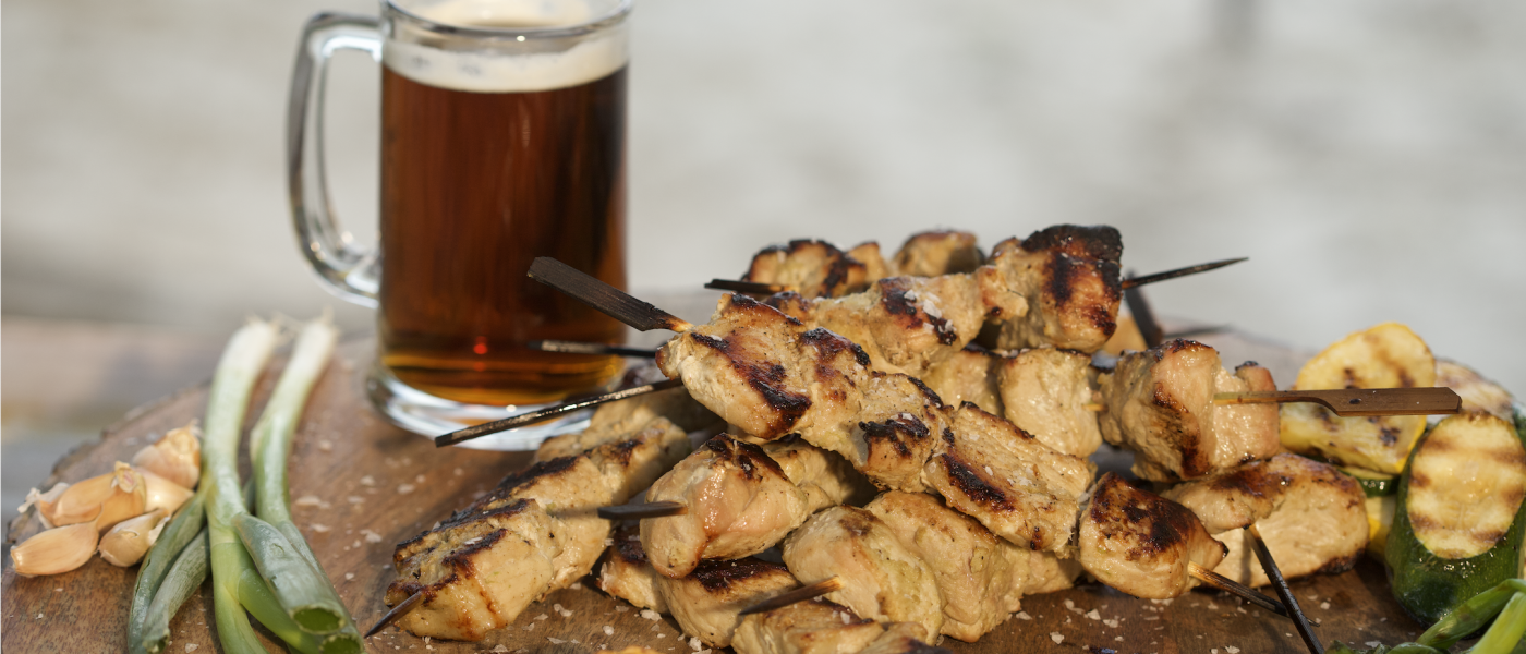 Precalienta la parrilla a fuego alto. Ensarta la carne de cerdo en los pinchos y úntala con aceite vegetal.