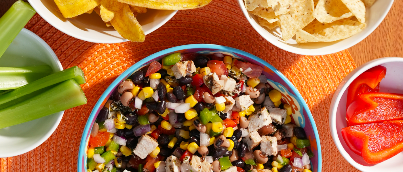 - En un tazón grande para mezclar, coloca la cebolla roja, los pimientos morrones rojos y verdes, el maíz dulce, los frijoles negros, los frijoles carita, el jalapeño y los tomates. Agrega el cilantro y la carne de cerdo cortada en cubitos. Mezcla suavemente.
