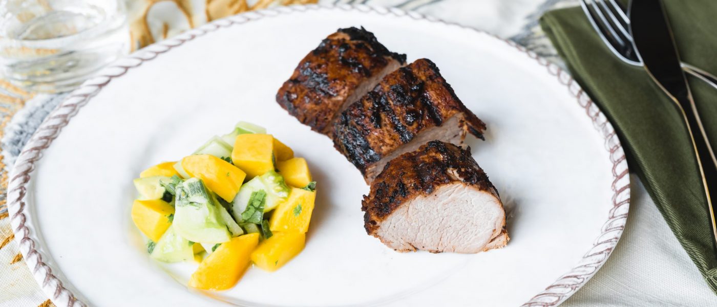 Prepara la parrilla para cocinar a fuego indirecto. Escurre y desecha el adobo de la bolsa. Asa la carne de cerdo, tapada, a fuego indirecto a temperatura media/alta durante 20 a 25 minutos o hasta que el termómetro marque 145 °F. Déjala reposar durante 5 minutos antes de cortarla.