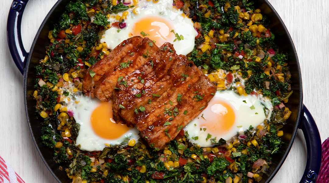 -Crea 6 pocillos en el hash y rompe un huevo en cada pocillo. Hornea hasta que las claras estén listas y las yemas aún estén líquidas, o hasta el punto de cocción deseado. Espolvorea los huevos con sal.