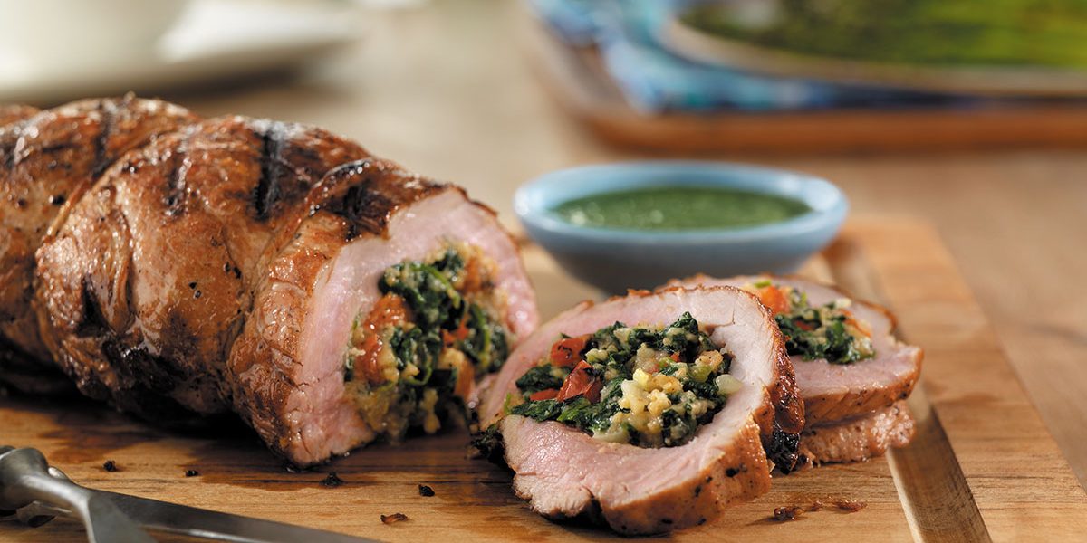 - Unta el relleno sobre la carne de cerdo. Enrolla la carne a lo largo y ata con hilo de cocina en cruz (o con un hilo dental regular sin cera) en tres o cuatro lugares.