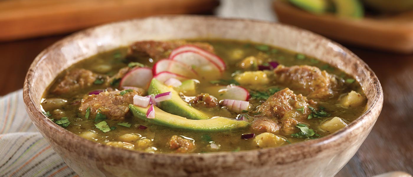 Simplifica esta receta utilizando de 2 a 3 tazas de salsa de chile verde en lata, la cual se puede encontrar en la sección mexicana o étnica de tu supermercado. Si no tienes chiles poblanos o pasilla, puedes utilizar chiles ancho como sustituto seco. Para hacer Pozole Rojo, utiliza salsa de chile rojo. Como guarnición, añade aguacate en rebanadas o en trocitos, lechuga o repollo rallado, cebolla picada, cilantro picado, rábanos en rebanadas, trozos de limón y/o chips de tortilla.