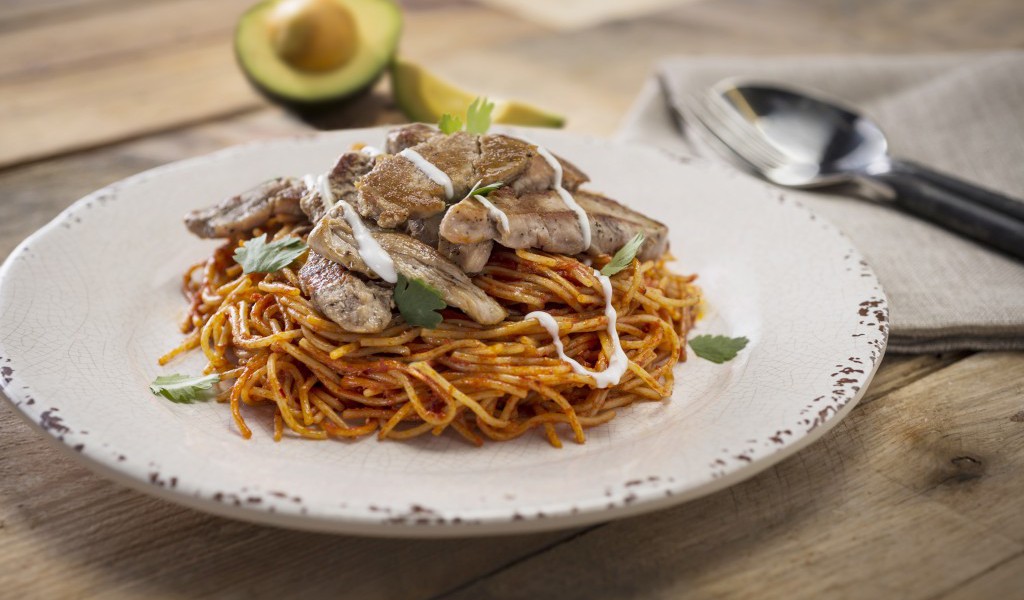 Sírvela con las tiras de cerdo encima de la pasta o fideos, rocíala con cilantro cortado en pedacitos y con un poquito de crema fresca o crema mejicana (opcional). Tambien puedes usar chuletas en tiras en vez de lomo. ¡Buen provecho!